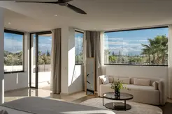 At ground level, Villa Montbel unfolds through a series of light-filled living rooms that connect seamlessly to the outdoors. The presence of a grand white piano gives the space a refined, lived-in character — equally suited to quiet mornings or intimate evenings.